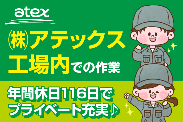 | 応募方法 | 下記住所まで履歴書をお送りください。 〒791-8524 松山市衣山1丁目2-5 (株)アテックス 総務部/西本まで ※ その他詳細は面談にて |
